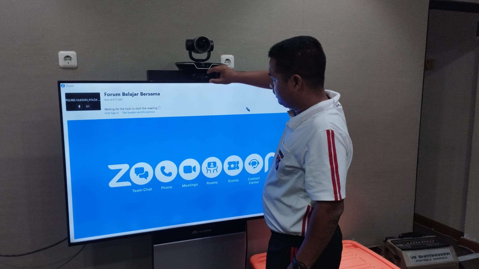 Anggota Tik Polres Cilegon Menyiapkan Sarana dan Prasarana Untuk Kegiatan Zoom meeting Dalam pelaksanaan kegiatan zoom meeting tersebut anggota TIK Polres Cilegon yang bertanggung jawab untuk menyiapkan peralatan zoom. Selain itu agar di tidak ada gangguan jaringan sebelum pelaksanaan anggota TIK melakukan pemeriksaan terhadap sarana dan prasarana tersebut . Satu jam sebelum kegiatan zoom meeting itu dimulai. Kapolres Cilegon AKBP. DR. MARTUA RAJA TARIPAR LAUT SILITONGA. melalui Kasi TIK AIPTU Suwanto, S.H. menyampaikan bahwa “untuk menunjang kelancaran penyampaian informasi anggota TIk Polres Cilegon selalu memeriksa sarana dan prasarana tersebut, sebelum maupun pada saat pelaksanaan akan selalu di monitor”