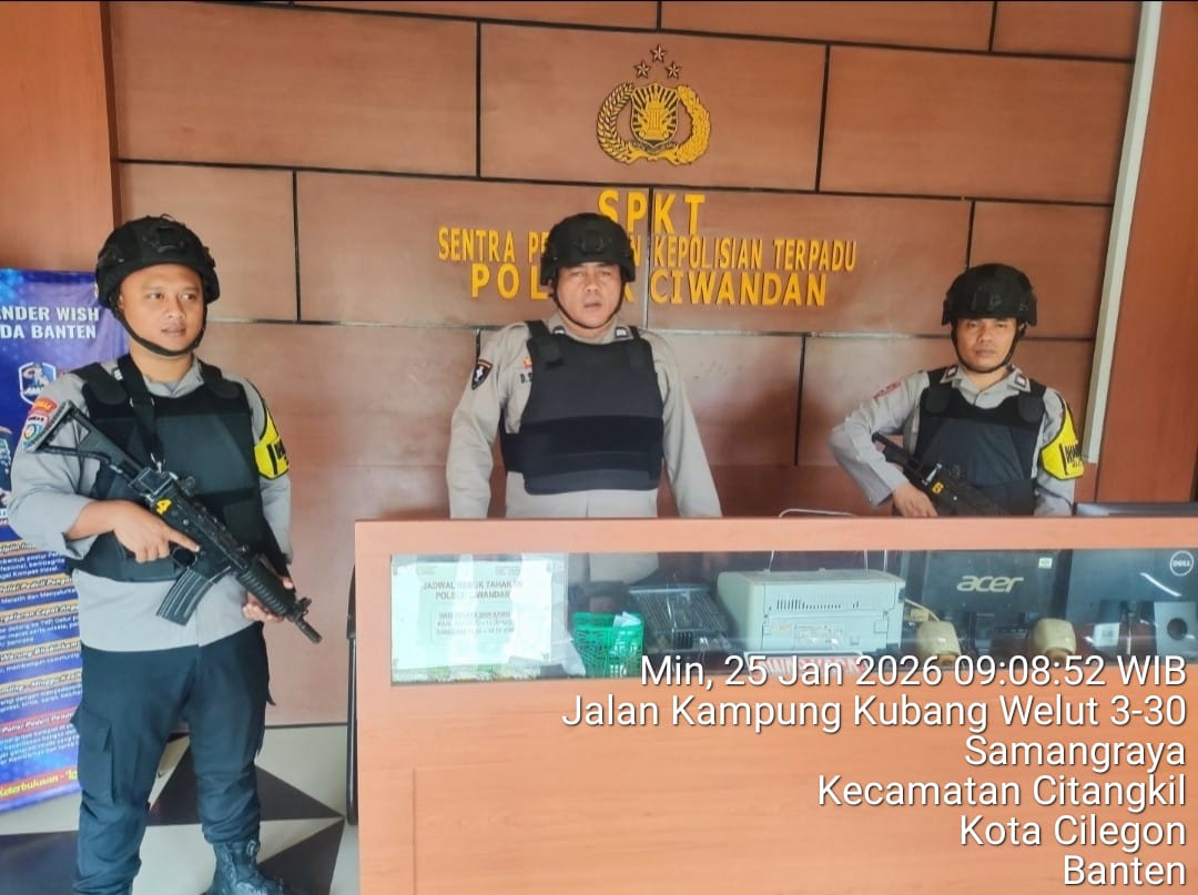 Cilegon – Polres Cilegon Polda Banten Guna mengantisipasi adanya potensi ancaman dan gangguan terhadap keamanan kantor maupun keselamatan personel piket jaga, Personel Polsek Ciwandan Polres Cilegon selalu tingkatkan kesiapsiagaan dan kewaspadaan dengan rutin menggelar kegiatan Sistem Pengamanan Mako (Sispam Mako), Minggu (25/01/2026).