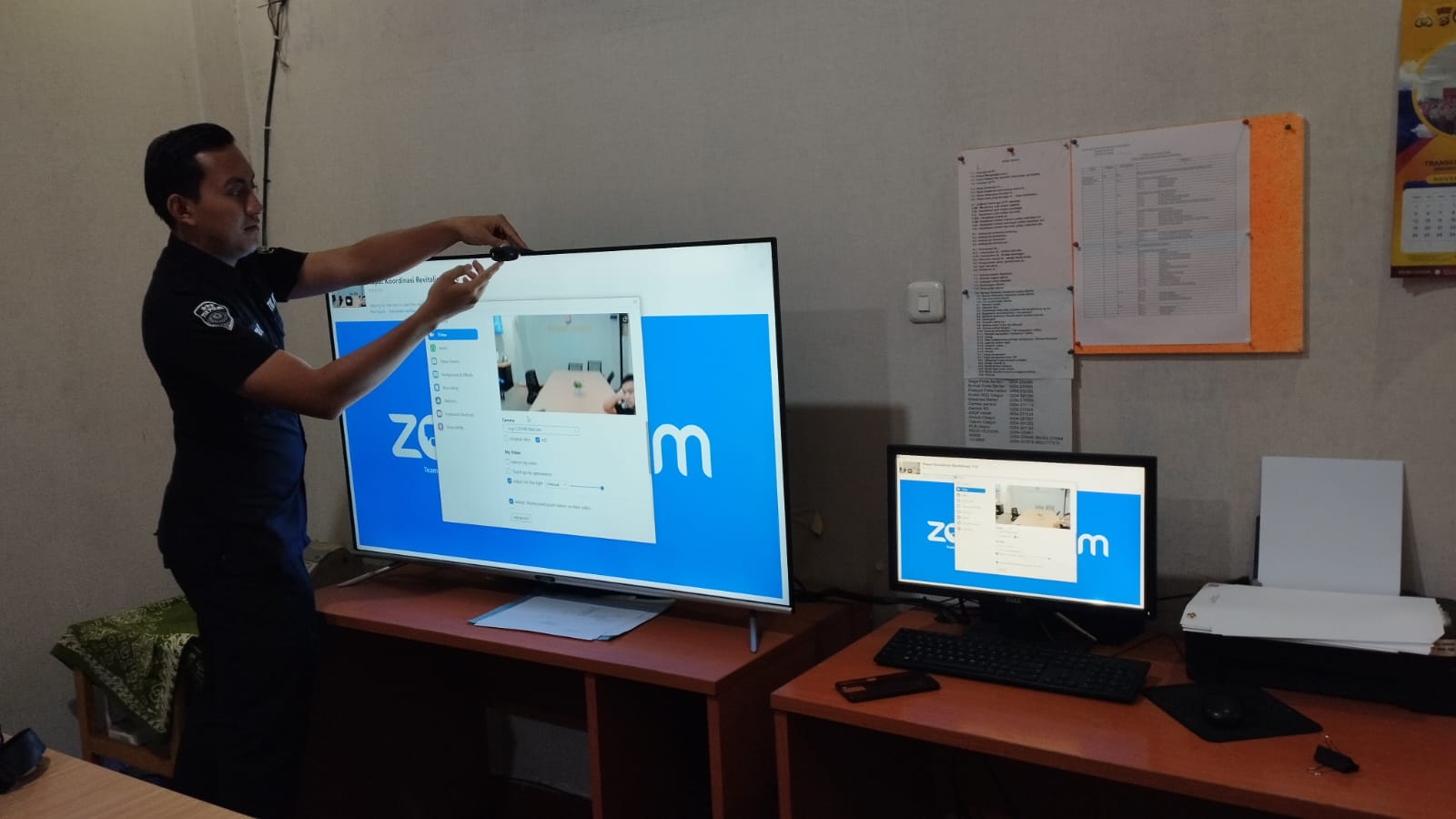 Anggota Tik Polres Cilegon Menyiapkan Sarana dan Prasarana Untuk Kegiatan Zoom meeting Dalam pelaksanaan kegiatan zoom meeting tersebut anggota TIK Polres Cilegon yang bertanggung jawab untuk menyiapkan peralatan zoom. Selain itu agar di tidak ada gangguan jaringan sebelum pelaksanaan anggota TIK melakukan pemeriksaan terhadap sarana dan prasarana tersebut . Satu jam sebelum kegiatan zoom meeting itu dimulai. Kapolres Cilegon AKBP. DR. MARTUA RAJA TARIPAR LAUT SILITONGA. melalui Kasi TIK IPTU Jajang Rohendi menyampaikan bahwa “untuk menunjang kelancaran penyampaian informasi anggota TIk Polres Cilegon selalu memeriksa sarana dan prasarana tersebut, sebelum maupun pada saat pelaksanaan akan selalu di monitor”