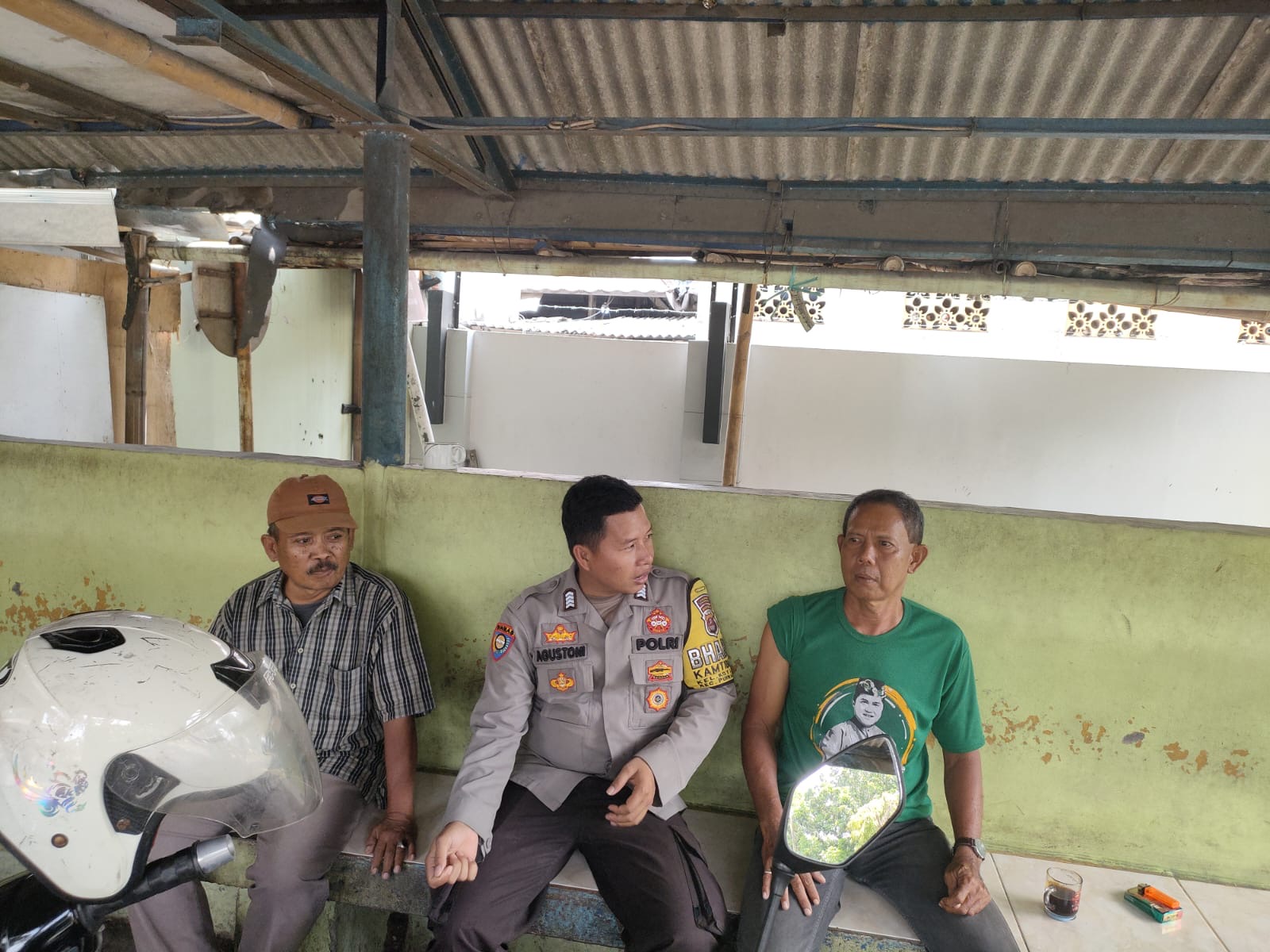 Personil Bhabinkamtibmas Polsek Purwakarta, Polres Cilegon, Bripka Agustoni, melaksanakan kegiatan sambang dan silaturahmi dengan para pengemudi ojek pangkalan di Propelat Komplek Perumahan KS, Kelurahan Kotabumi, Kecamatan Purwakarta